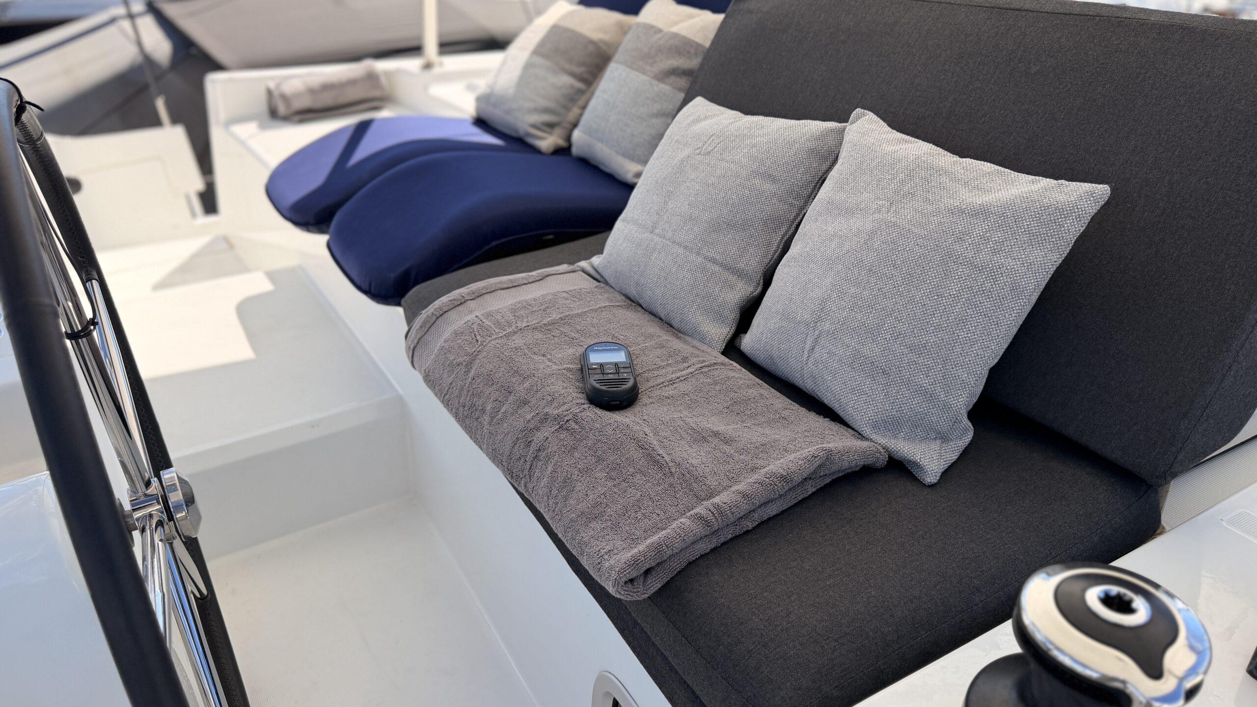 Boat equipment features Cockpit cushions (), Refrigerator (), Cockpit speakers (), Dinghy (), Autopilot (), Electric winches (), Chart plotter (), Bimini (), Lazy bag (), Electric toilet (), Holding tank (), Inverter (), Solar Panels () and Refrigerator ().